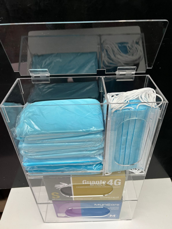 DISPENSADOR DE ACRÍLICO PARA CAJA DE GUANTES QUIRÚRGICOS, PECHERAS Y MASCARILLAS A.2.B.