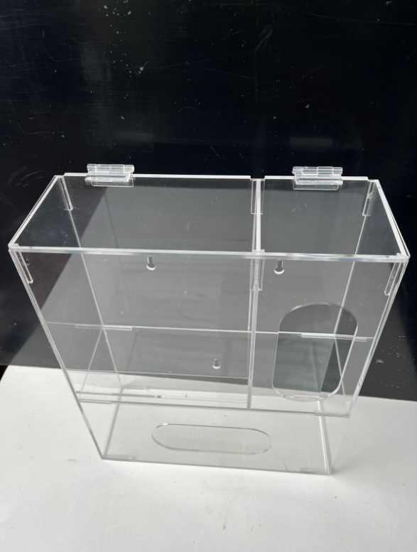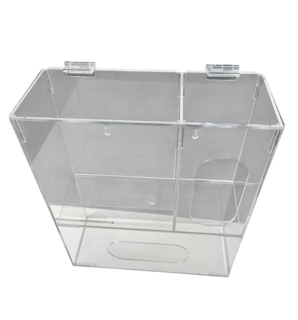 DISPENSADOR DE ACRÍLICO PARA CAJA DE GUANTES QUIRÚRGICOS, PERCHEROS Y MASCARILLAS. A.1.B. Con tapa y dos bisagras acrílicas.