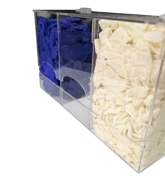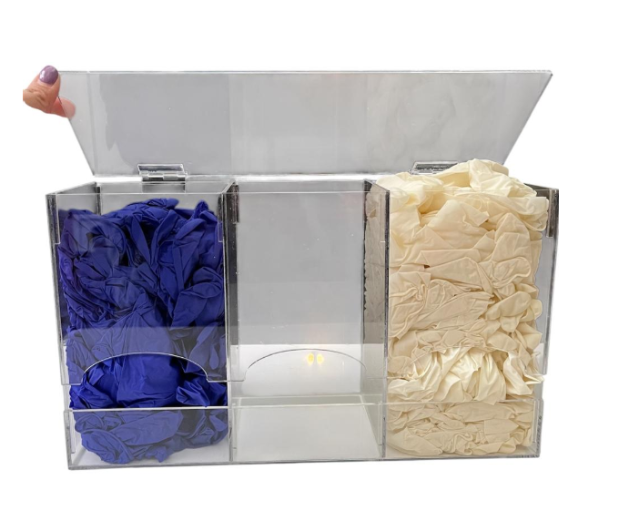 DISPENSADOR DE ACRÍLICO PARA GUANTES QUIRÚRGICOS A GRANEL. (Grande) Con tapa y dos bisagras acrílicas.