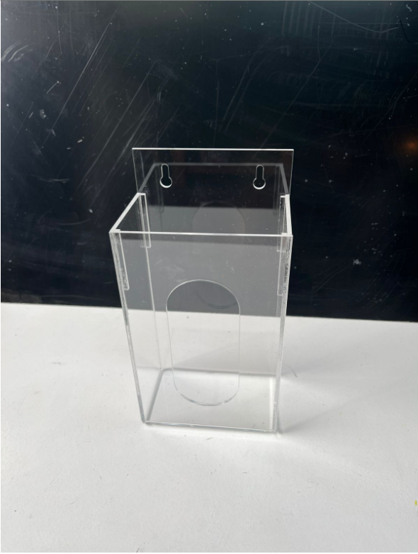 DISPENSADOR DE ACRÍLICO PARA CAJA DE GUANTES QUIRÚRGICOS, PERCHEROS Y MASCARILLAS. A.1.B. Con tapa y dos bisagras acrílicas.